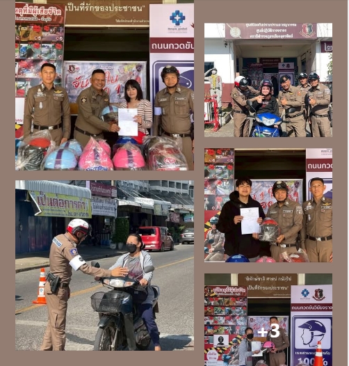 ขับเคลื่อนโครงการ จับ 1 ใบ แลก 1 ใบ(1 ใบสั่งข้อหาไม่สวมหมวกนิรภัย ปรับ 200 บาท แจกหมวกนิรภัย 1 ใบ)