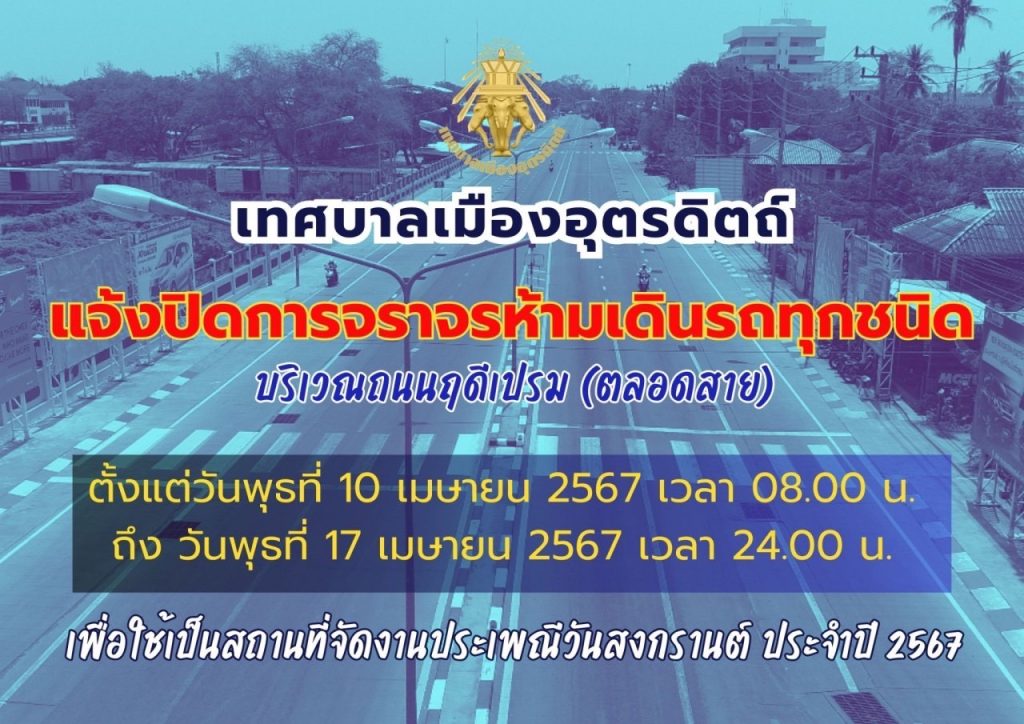 งานจราจร สภ.เมืองอุตรดิตถ์ และเทศบาลเมืองอุตรดิตถ์ แจ้งประชาสัมพันธ์ ปิดการจราจร วันที่ 13 – 15 เมษายน 2567