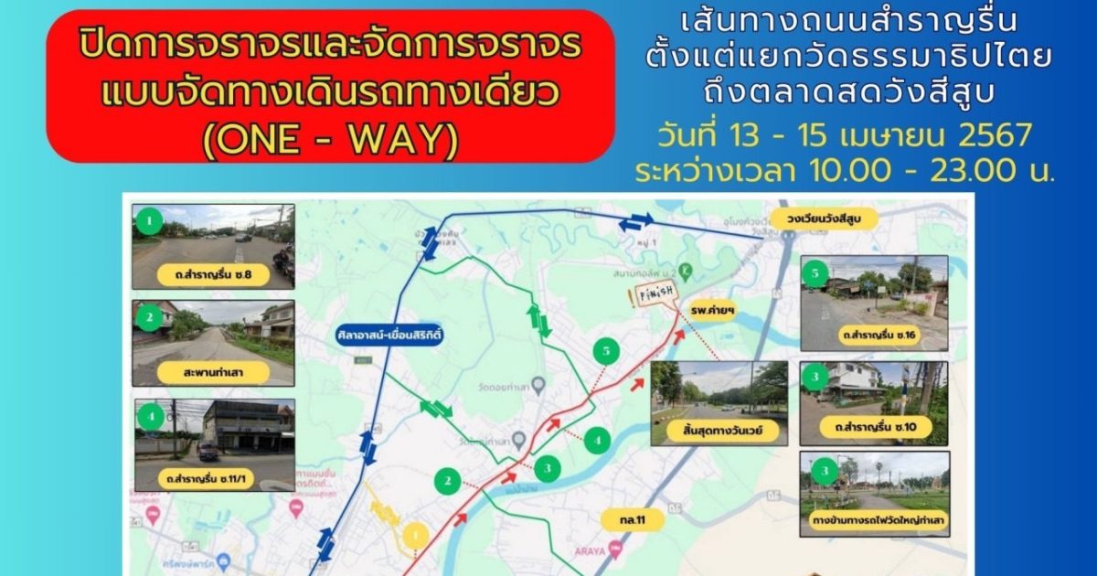 งานจราจร สภ.เมืองอุตรดิตถ์ และเทศบาลเมืองอุตรดิตถ์ ประชาสัมพันธ์การปิดการจราจรและจัดการจราจร แบบจัดทางเดินรถทางเดียว (ONE – WAY) บริเวณเส้นทางถนนสำราญรื่น ตั้งแต่แยกวันธรรมาธิปไตย ถึงตลาดสดวังสีสูบ เ วันที่ 13 – 15 เมษายน 2567 ระหว่างเวลา 10.00 น. – 23.00 น. และบริเวณถนนฤดีเปรม ตลอดสาย ห้ามเดินรถทุกชนิด ตั้งแต่วันพุธที่ 10 เมษายน 2567 เวลา 08.00 น.ถึงวันพุธที่ 17 เมษายน 2567 เวลา 24.00 น.