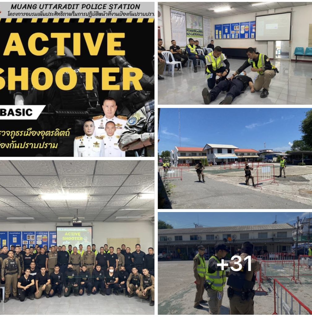 Active Shooter Basic ณ ห้อง ประชุม สภ.เมืองอุตรดิตถ โดยมอบหมายให้ พ.ต.ท.อำนาจ รอดดอนไพร รอง ผกก.ป.สภ.เมืองอุตรดิตถ์,พ.ต.ต.ประธาน เล็กคำ สวป.สภ.เมืองอุตรดิตถ์ พร้อมชุดที่ผ่านการอบรม Active Shooter เป็นผู้บรรยายภาคทฤษฎีและทำการฝึกสอน ให้กับข้าราชการตำรวจงานป้องกันปราบปราม ตามนโนบายท่าน ผบ.ตร ” learning by doing “ เรียนรู้แบบลงมือทำ โดยแบ่งการฝึกดังนี้